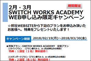【2・3月WEB申し込み限定キャンペーン】WEBSITEからSWITCH WORKS ACADEMYの定額プランをお申込み頂いたお客様へ、特典をプレゼント致します。