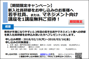 【新入社員研修申し込み対象 期間限定キャンペーン】教育が手薄になりやすい2.3年目の若手社員やマネジメント層への研修を、新入社員研修をお申込み頂いたお客様へ無料でプレゼントいたします。