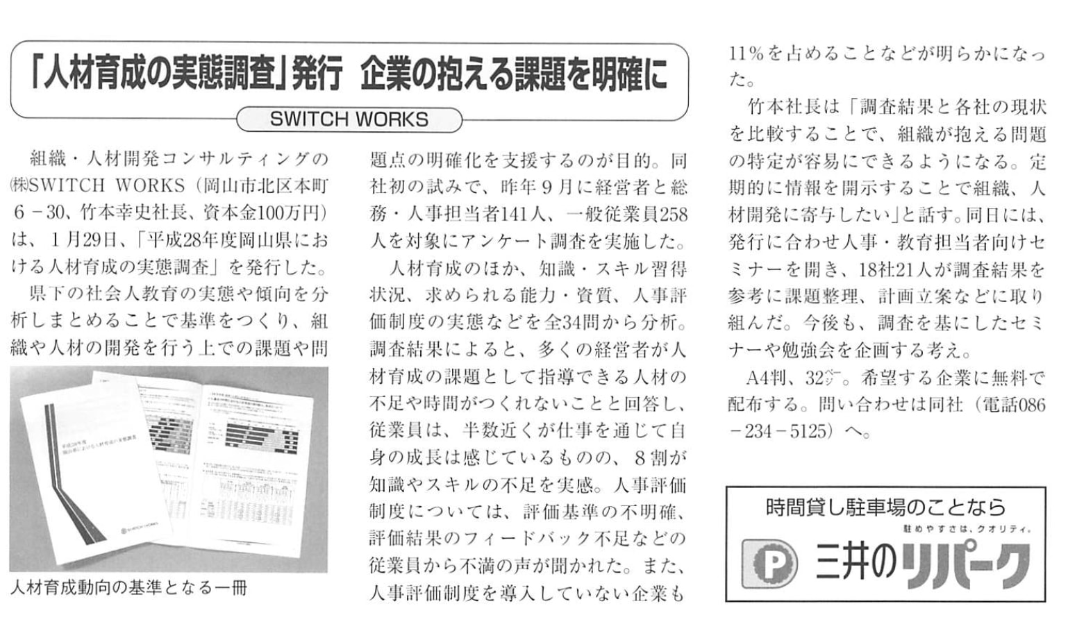 弊社発行「平成28年度岡山県における人材の実態調査」を掲載していただきました。