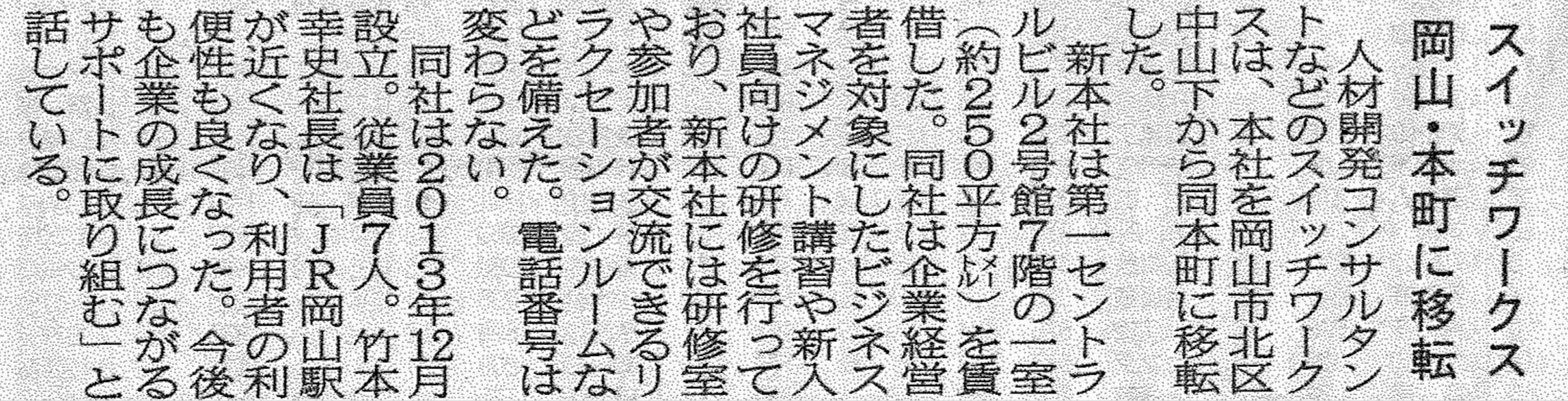 2016年12月19日本社移転に伴う記事を山陽新聞様に取材していただきました。今後とも「知識創造拠点」としての本社機能を高めてまいりたいと思います。今後ともよろしくお願いいたします。