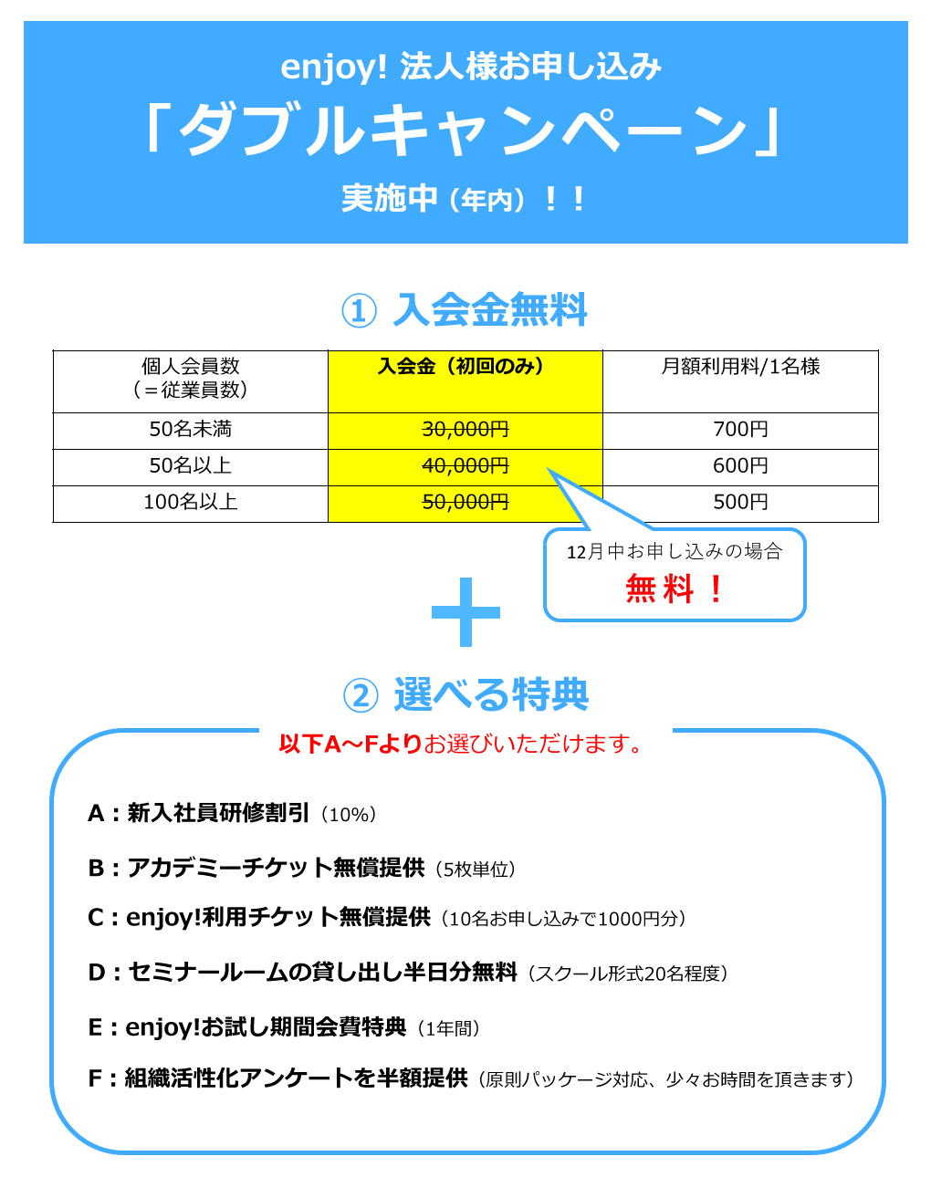 年内にenjoy!法人会員にお申し込みになりますと、ダブルで特典がついてきます。