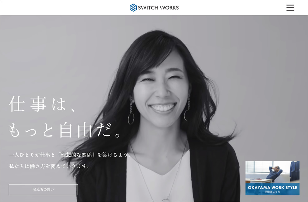 本日12月1日、スウィッチワークスの新しいウェブサイトを公開しました。 新しいウェブサイトでは人材育成、組織開発、制度構築、福利厚生enjoy!などの各種サービス情報をはじめとし、オンとオフをうまく使い分けた様々な働き方を紹介するOKAYAMA WORK STYLEなどの気づきに繋がるコンテンツも掲載しております。