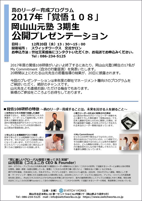2017年「覚悟108」岡山山元塾 3期生 公開プレゼンテーション 12月20日(水)開催