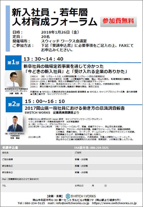 新卒社員の職場定着事業を通じて分かった「今どきの新入社員」と「受け入れる企業のありかた」、また2017岡山県一般社員における働き方の意識調査について調査報告をいたします。