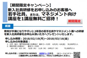 【新入社員研修申し込み対象 期間限定キャンペーン】 教育が手薄になりやすい2.3年目の若手社員やマネジメント層への研修を、新入社員研修をお申込み頂いたお客様へ無料でプレゼントいたします。