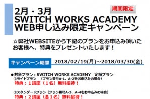 【2・3月WEB申し込み限定キャンペーン】 WEBSITEからSWITCH WORKS ACADEMYの定額プランをお申込み頂いたお客様へ、下記特典をプレゼント致します。